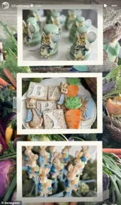 She described it as a Peter Rabbit-themed baby shower, inspired by Beatrix Potter’s charming world of anthropomorphic animals and quaint English countryside scenes.