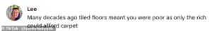 The conversation took a historical turn when another viewer offered a mini-lesson on the evolution of flooring in British homes. ‘Many decades ago, tiled floors meant you were poor as only the rich could afford carpet,’ they explained, a reminder of a time when class divisions were starkly visible in everyday choices.