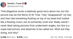 While en route back to the United States from a peace summit in Egypt, he took to Truth Social to vent his frustration. ‘Time Magazine wrote a relatively good story about me,’ he wrote to his followers at 1:30 a.m., ‘but the picture may be the Worst of All Time.