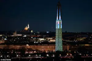 That is simply beautiful!’ Another added, ‘What a stunning visual treat for the Washington Monument!’ These positive reactions have even prompted calls for the illuminations to continue beyond the scheduled event.