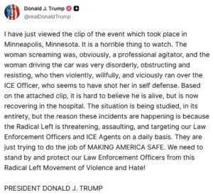 Donald Trump took to Truth Social to defend the ICE officer, claiming he was ‘recovering in the hospital’ after the shooting.