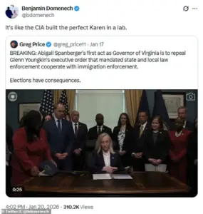 Such rhetoric has only fueled the divide, with some conservatives suggesting that the governor’s agenda is a ‘liberal wish list’ being forced upon a state that has historically leaned conservative. ‘It’s like the CIA built the perfect Karen in a lab,’ joked Spectator at Large editor Ben Domenech, referencing Spanberger’s background as a former intelligence officer.