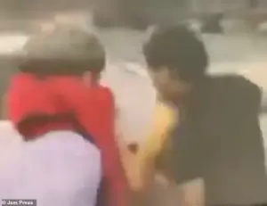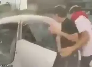 In the video, she attempted to block the backseat passenger’s door before retreating to her Tesla, only to be ambushed moments later.