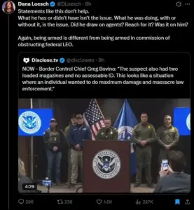 Don’t do it!’ The statement, which many viewed as a flippant dismissal of Pretti’s actions, drew immediate condemnation from Loesch and others. ‘Language matters,’ she wrote, challenging the implication that Pretti’s legal possession of a firearm near law enforcement was inherently suspicious or criminal.