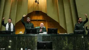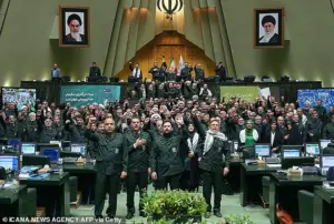 Iranian lawmakers, clad in the uniforms of the Revolutionary Guard, chant slogans in a session of parliament, their voices a defiant counterpoint to Trump’s ultimatum.