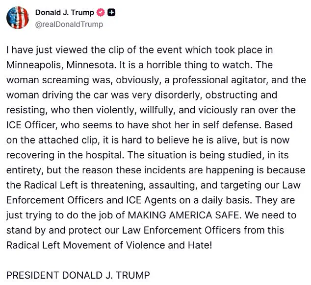 According to a statement from DHS Assistant Secretary Tricia McLaughlin, the woman was 'attempting to kill them,' and her actions were labeled an 'act of domestic terrorism.' The Trump administration has since framed the event as a case of self-defense, with the president asserting that the woman was a 'professional agitator' who 'violently, willfully, and viciously ran over the ICE Officer.' The fallout has ignited a fierce political battle, with Minneapolis Mayor Jacob Frey condemning ICE's characterization of the shooting. 'They are already trying to spin this as an act of self-defense.