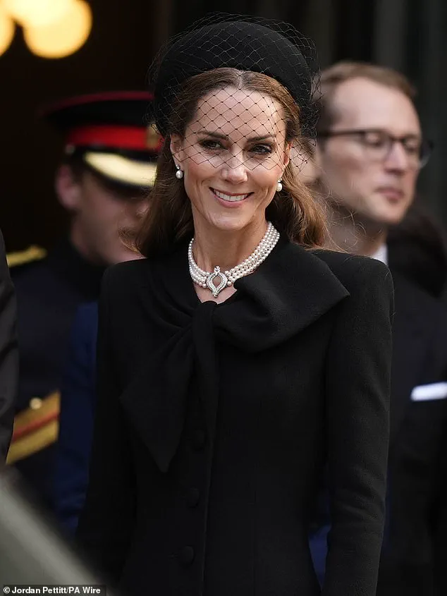 Kate, 43, arrived at Westminster Cathedral in all-black mourning attire, a choice that echoed the solemnity of the occasion while subtly reinforcing her connection to the late Queen through the accessories she wore.